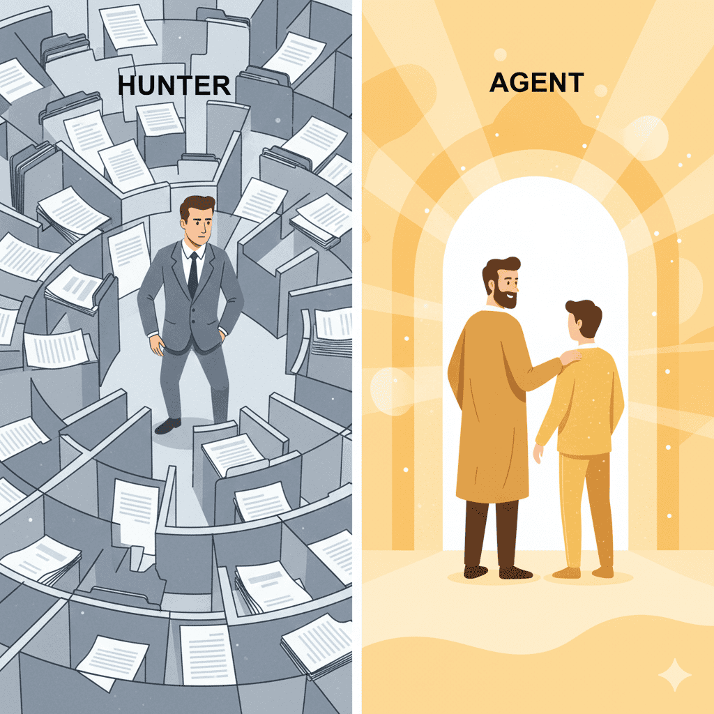 Le conflit d’intérêt du chasseur est simple : il respecte le budget, les attentes et parfois les caprices de son client (l’entreprise). L’Agent, lui, a une mission simple : trouver avec vous votre prochain CDI. En révélant ce que les robots et les recruteurs pressés ne voient pas chez vous, il transforme une candidature « standard » scorée à 55% en moyenne en une TOP candidature scorée à 90%. Etre prêt(e) fera toujours la différence.